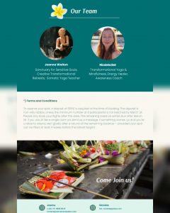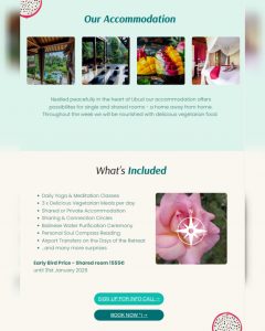 Daily Yoga and meditation practices, balinese water purification ceremony, personal soul compass readings and many more surprises are included.